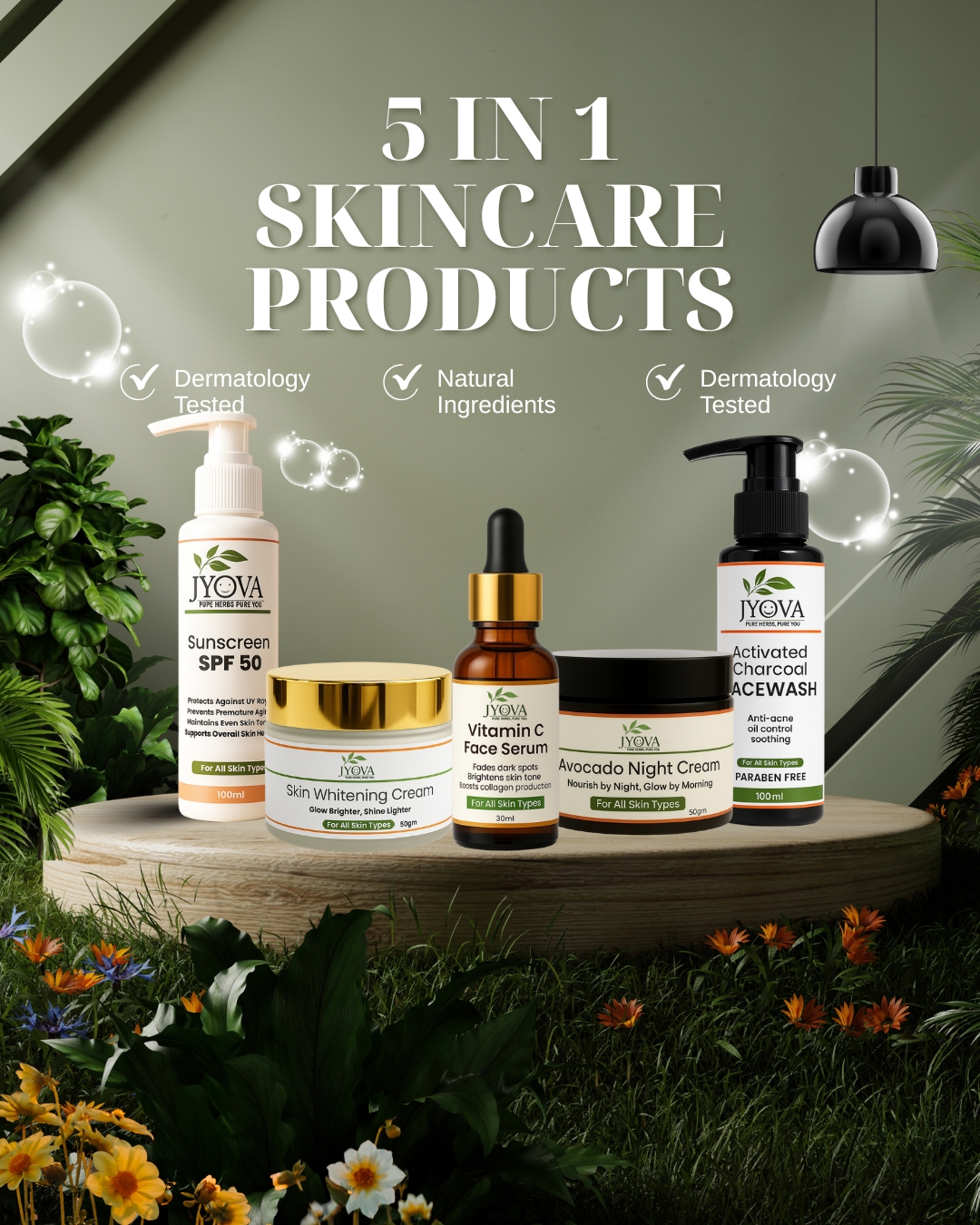 JYOVA 5 in 1 Complete Skincare Combo for Men & Women | Sunscreen SPF 50, Vitamin C Serum, Skin Whitening Cream, Avocado Night Cream & Activated Charcoal Facewash