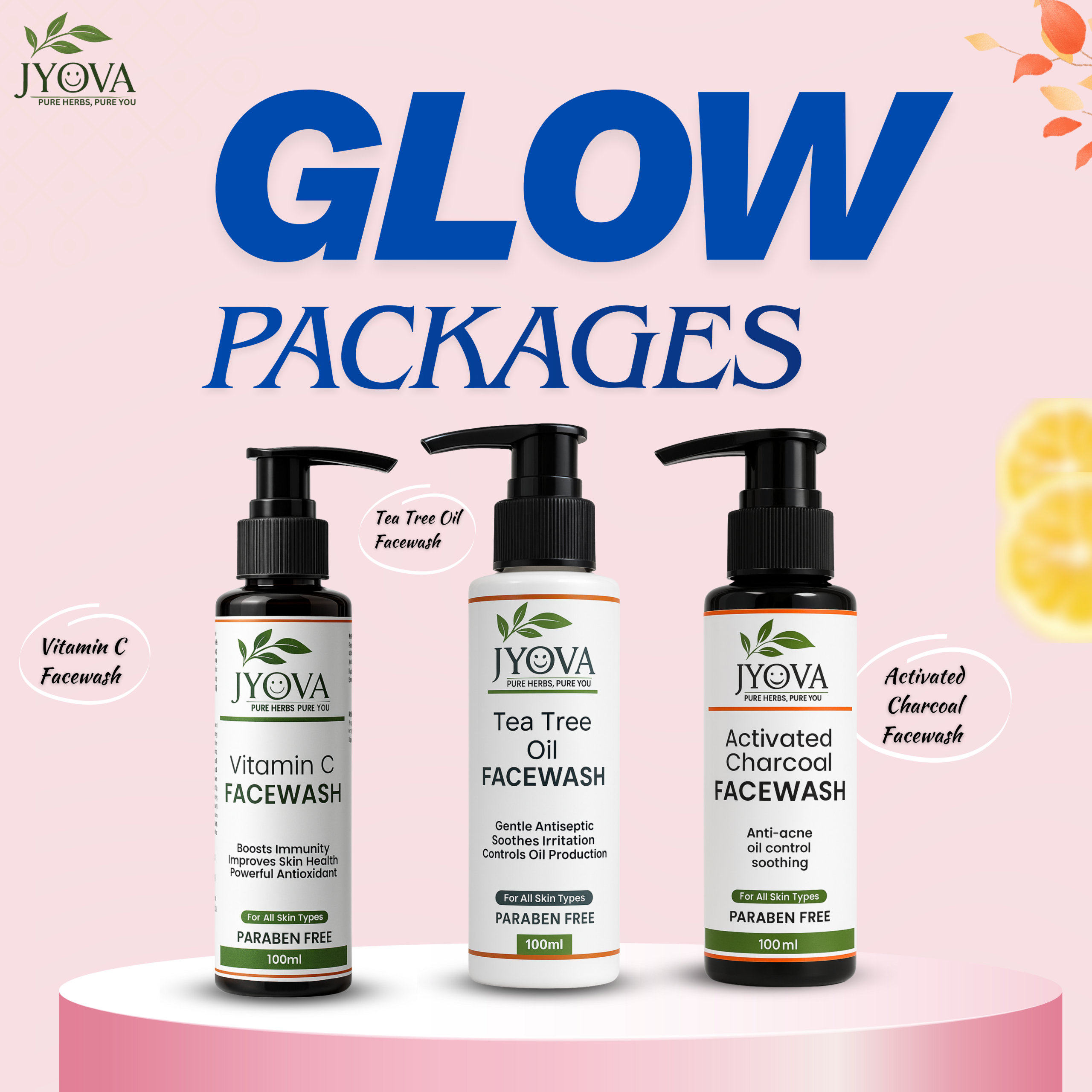Jyova 3-Step Facewash Combo – Tea Tree Oil (100ml), Vitamin C (100ml) & Activated Charcoal Facewash (100ml)
