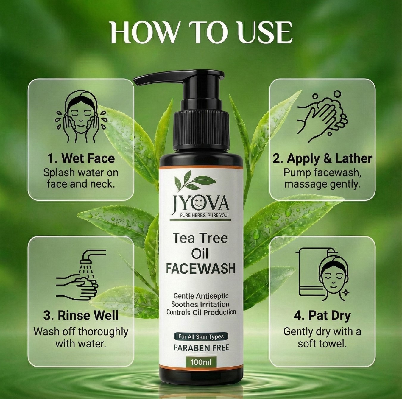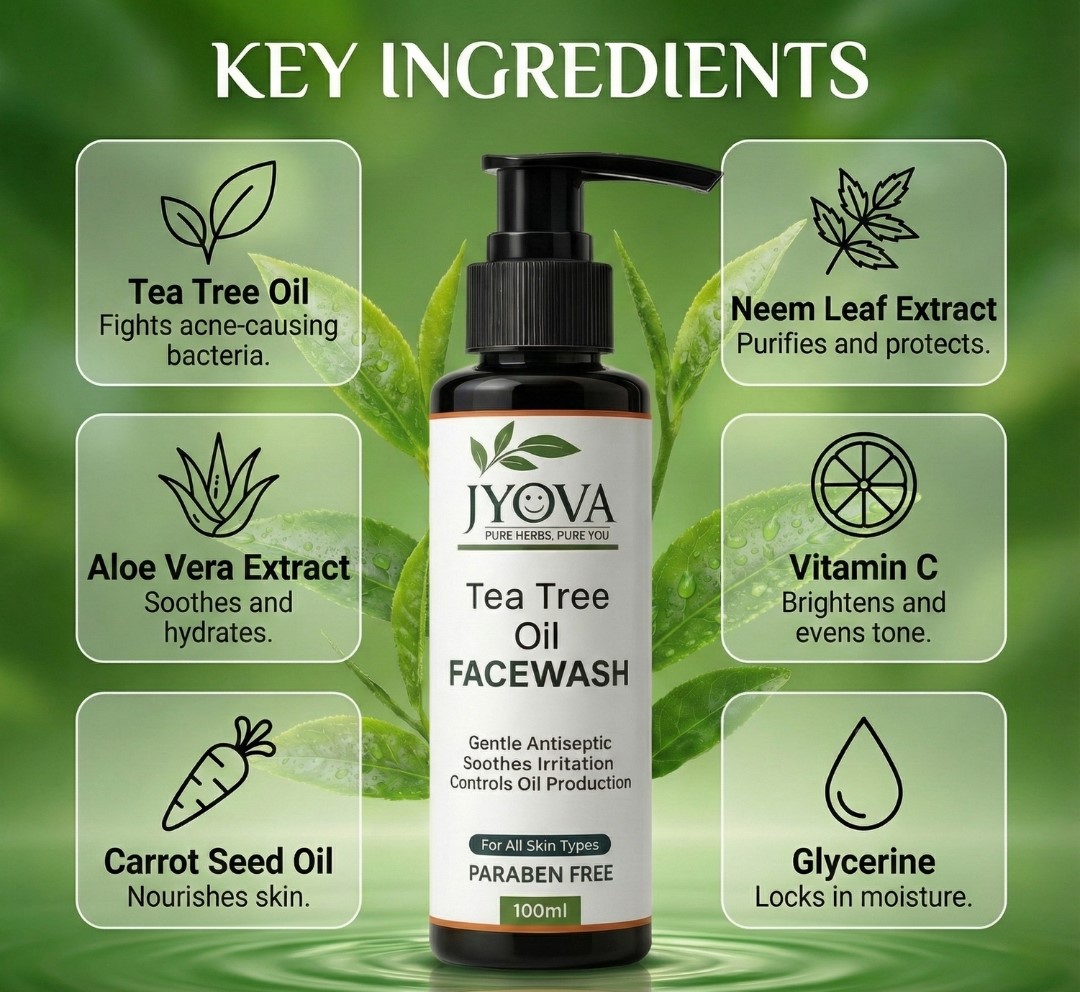 JYOVA Tea Tree Oil Face Wash – Anti-Acne, Oil Control & Deep Cleansing Face Cleanser with Neem, Aloe Vera & Vitamin C | For All Skin Types | 100ml