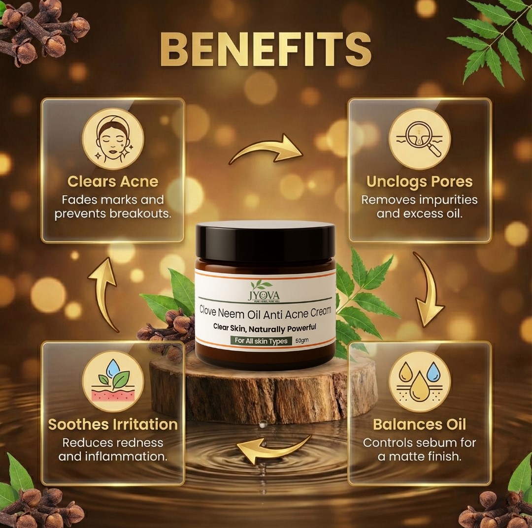 With regular use, JYOVA Clove Neem Oil Anti Acne Cream helps reduce pimples, control excess oil, and promote smoother, healthier-looking skin.